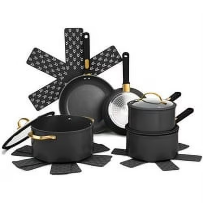- 12-piece set with fry pans, saucepans, and stock pot
