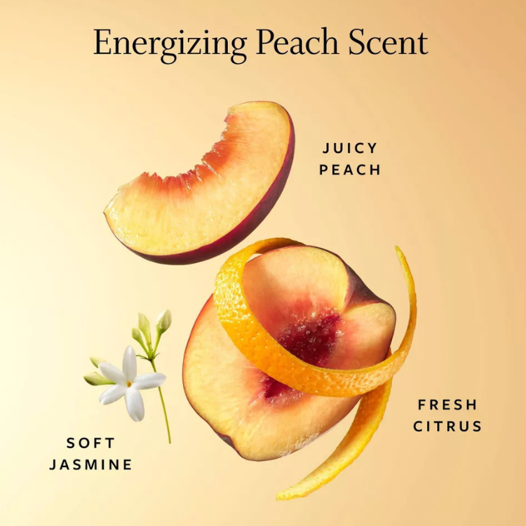 • Energizing peach scent with notes of peach, lemon, and white jasmine