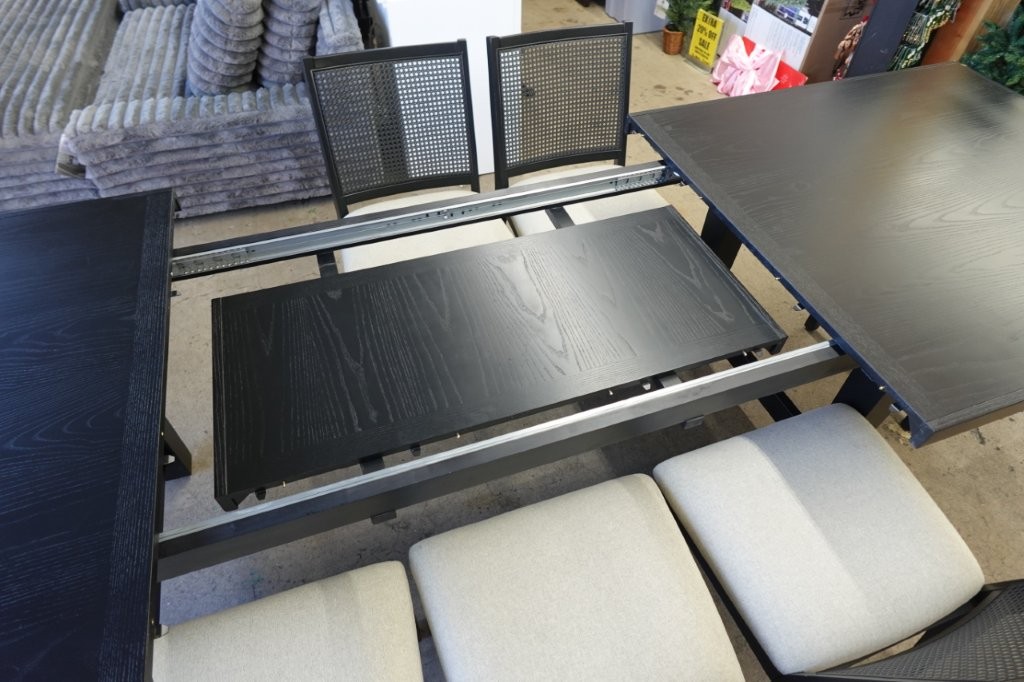 - Includes one extendable rectangular dining table and seven upholstered chairs