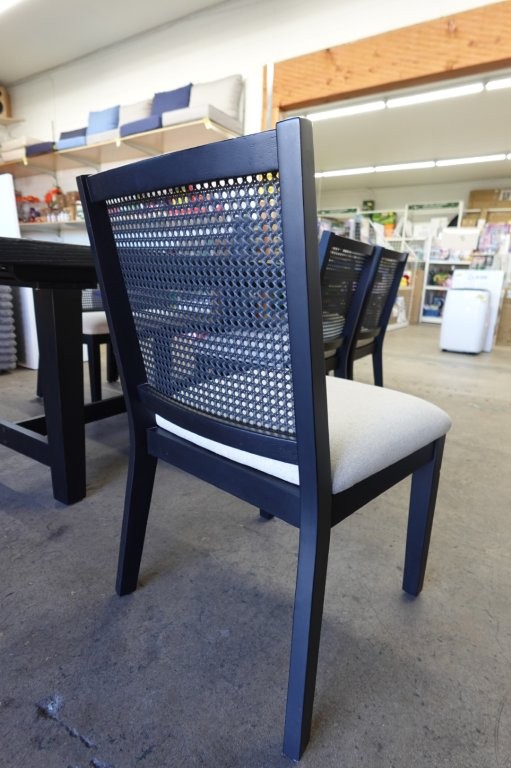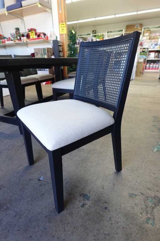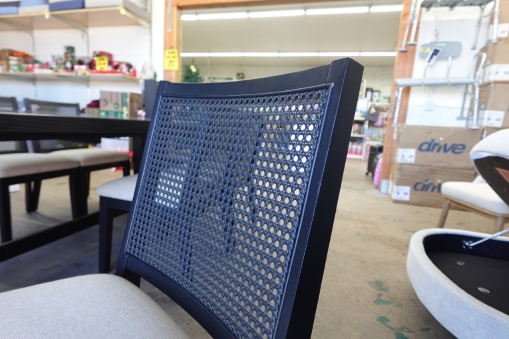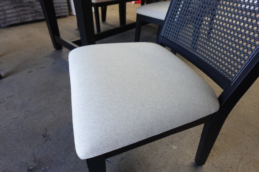 - Chairs feature beige fabric upholstery with woven faux rattan back inserts