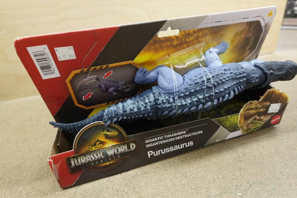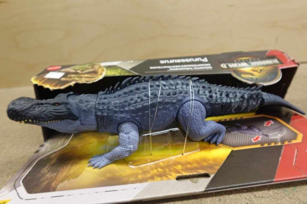 - Large Purussaurus action figure inspired by Jurassic World Rebirth with dynamic play features