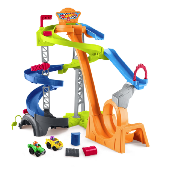 - Toddler-safe race track with 4 distinct stunt courses: spiral launcher, 360° loop, ring of fire jump, and off-road path