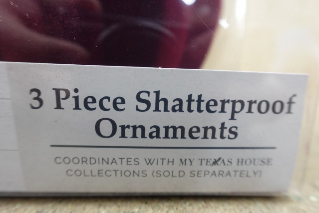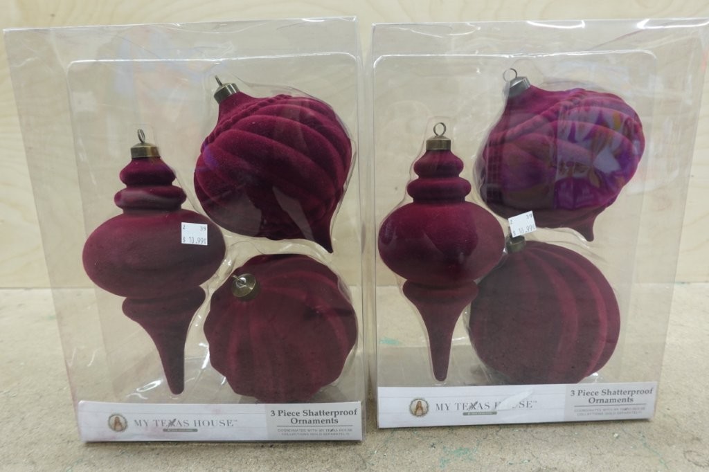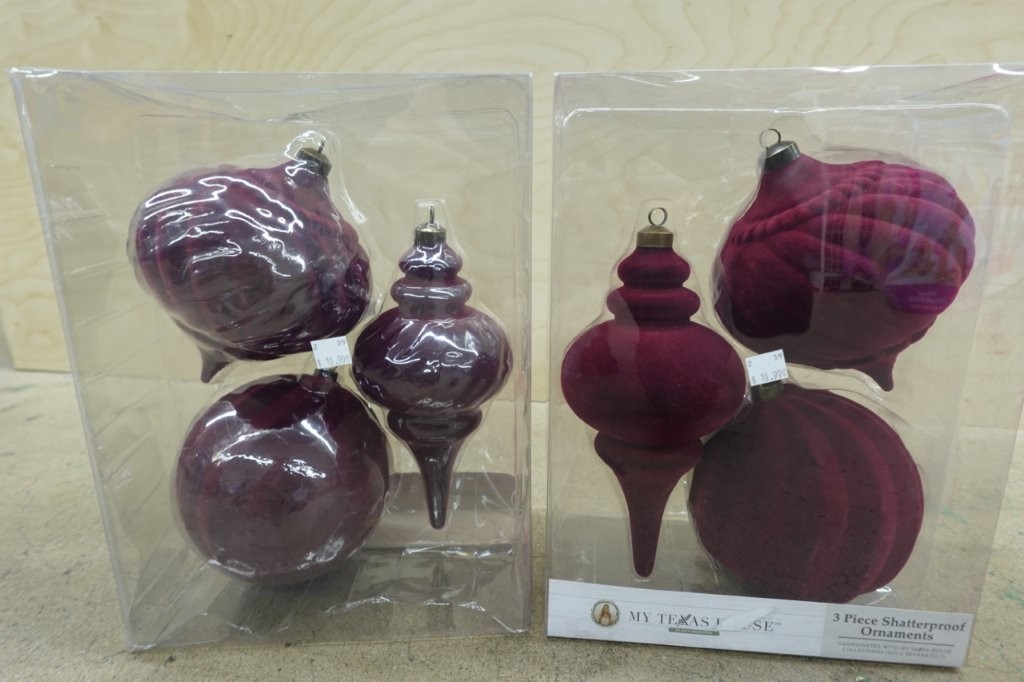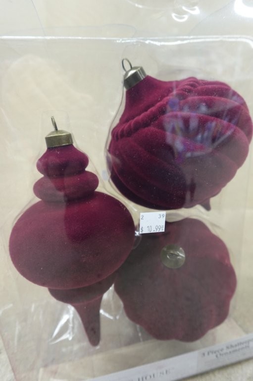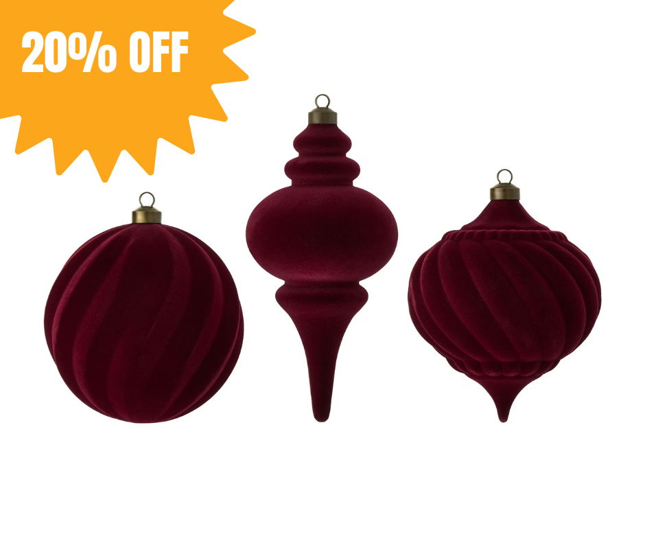 • Set of three 10-inch red flocked Christmas ornaments