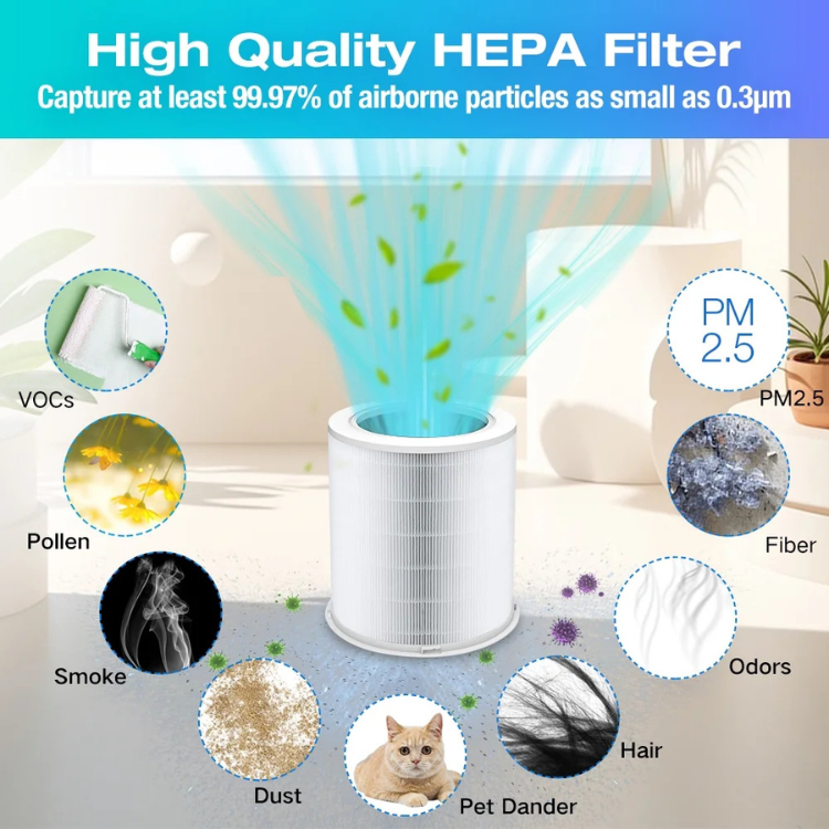 • H13 True HEPA filter captures 99.97% of particles down to 0.3 microns like dust, pollen, smoke, and pet dander