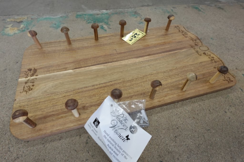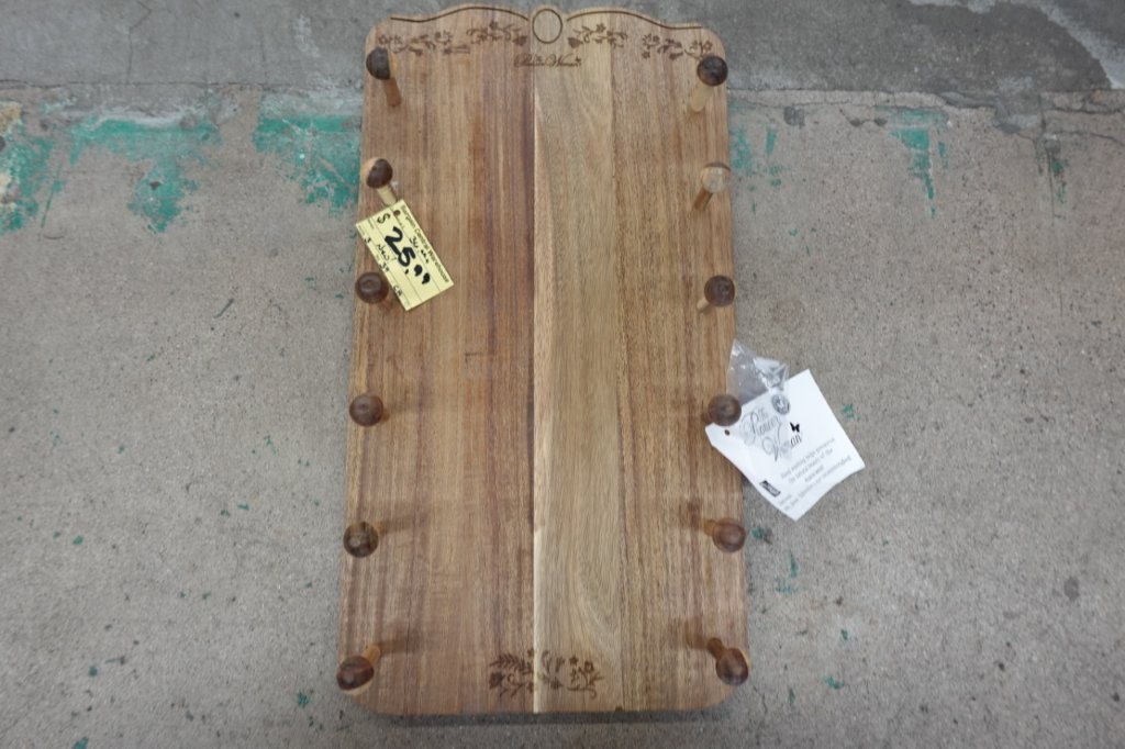 - Wall-mounted wooden rack holds up to six rolling pins